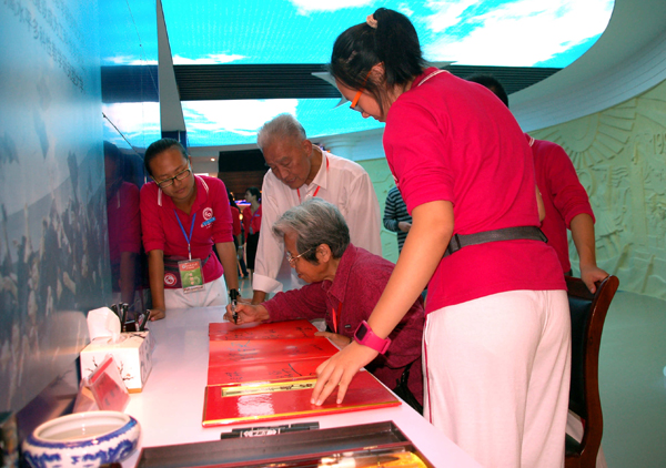 在为期两天的校史馆开放参观中,档案馆专门组织了校史文化推广会14名讲解员以及校团委推荐的19名志愿者投入到繁重的接待任务工作中,大家用微笑、青春与责任迎接着从四面八方“回家”的校友们。讲解员2011级陈晨在给首届校友讲解完感慨地说:“我现在明白了,我讲解的不是学校历史,而是我接待的这批老校友们的青春啊!”校史馆内,已微微泛黄了的黑白照片里当年英姿飒爽的青年男女而今华发苍苍的老者无疑成为最闪亮的明星,一群年轻学生粉丝们激动地围在他们身旁争相要求合影,欢声笑语在校史馆里回荡,温情与暖流在此汇聚、交融并传递着……
